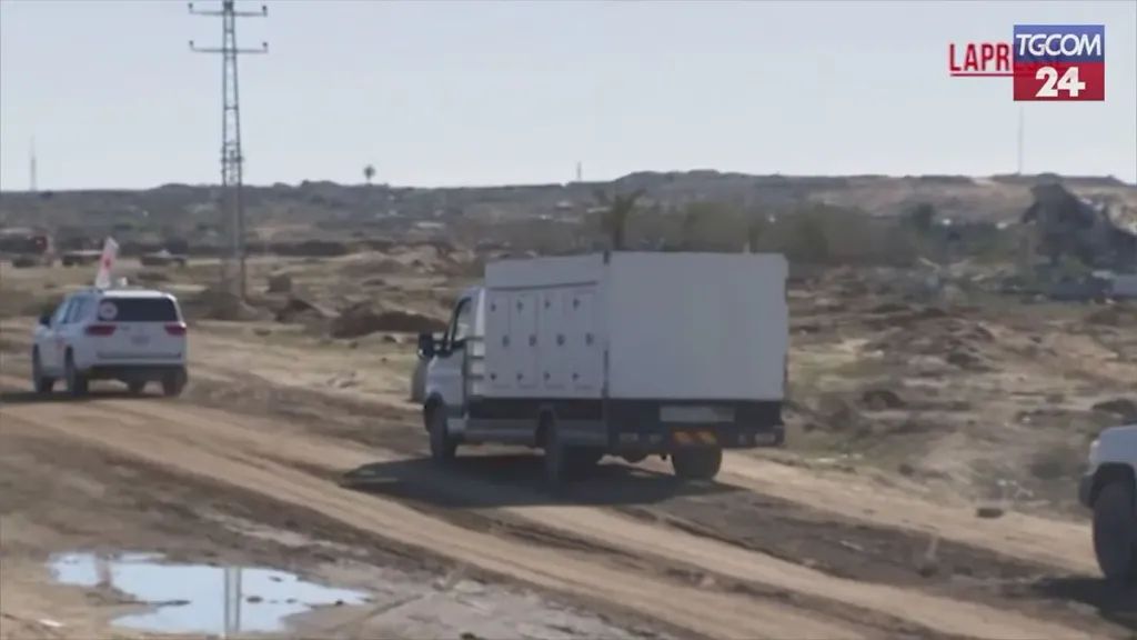 Un convoglio di veicoli della Croce Rossa riporta i corpi di prigionieri palestinesi da Israele a Gaza. La restituzione dopo che il primo ministro israeliano Benjamin Netanyahu ha confermato che i resti consegnati allo Stato ebraico martedì sera da Hamas sono stati identificati come quelli dell’ostaggio Dror Or: era stato rapito dal kibbutz Bèeri durante gli attacchi del 7 ottobre 2023.